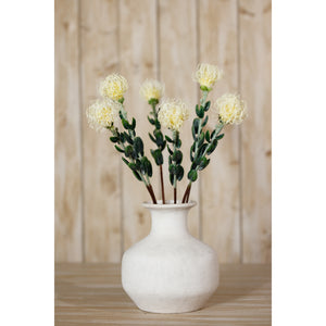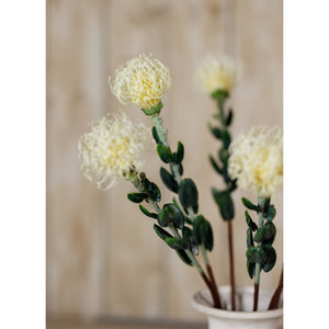Introducing the captivating Cream Pincushion Protea Spray, a stunning addition to any floral arrangement or home decor. This faux floral marvel features the iconic, intricate blooms of the Protea, a beloved South African wildflower known for its striking appearance and long-lasting beauty. The delicate, cream-colored petals create a soft, elegant focal point that will instantly elevate any space, while the lush foliage and sturdy stem provide a natural, organic touch. Pair this versatile spray with other neutral-toned botanicals or vibrant blooms to create a cohesive, visually striking display that will impress your customers and transform any interior style, from modern minimalist to rustic chic. Height 61cm Width 0cm Depth 0cm