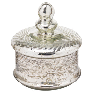 This handcrafted trinket jar with a silver foil finish and etched pattern is perfect for your shelf. Pair with the larger version for a stunning display.