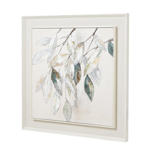 Elevate your customers' spaces with our exquisite Dolce Mottle Leaf Framed Painting. This captivating piece showcases delicate, silvery leaves rendered in intricate detail, creating a sense of ethereal beauty and natural elegance. The soft, muted palette of whites, greys, and subtle greens brings a calming presence to any room, making it perfect for contemporary, transitional, or Scandinavian-inspired interiors. The textured canvas adds depth and dimension, while the sleek white frame provides a clean, modern finish that complements a wide range of decor styles. This versatile artwork pairs beautifully with neutral furnishings, metallic accents, and organic textures like linen or jute. Ideal for creating a serene focal point in bedrooms or living rooms this piece also works well in curated gallery walls or as part of a nature-inspired vignette. Its timeless appeal and high-quality craftsmanship ensure it will be a cherished addition to your customers' homes for years to come.